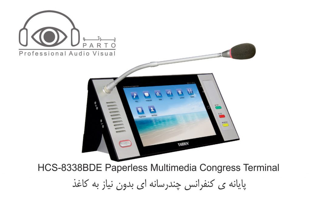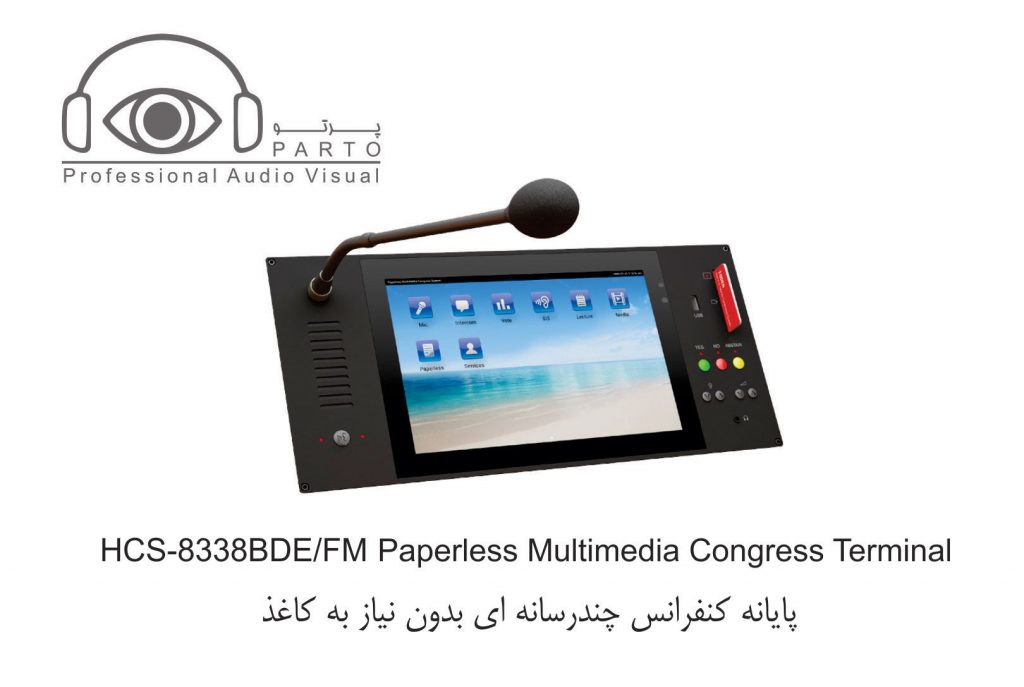 مدل HCS-8338BDE …………واحد شرکت کننده ، صفحه نمایش LCD 10 اینچی با رزولوشن ۱۲۸۰ X 800 ، صفحه نمایش لمسی خازنی ، دارای دوربین ۵ مگاپیکسلی ، دارای امکان سخنرانی و رای گیری ، دارای ۶۴CHs X 2 ، نمایش ویدئو و مکالمه ویدئویی ، سرویس خدماتی کنفرانس ، دارای IC-Card خوان توکار ، دارای nameplate چاپی ، پانل نقره ای خاکستری + پایه مشکی